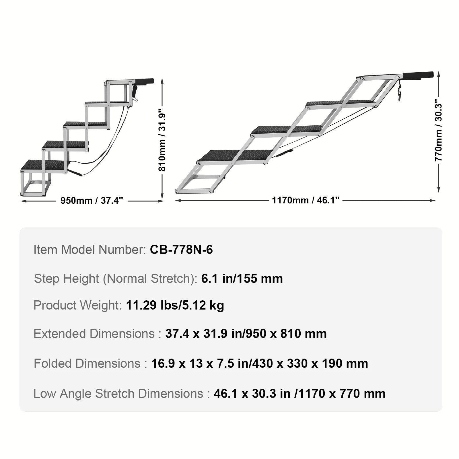 • Product Dimensions: At a normal stretch angle, the portable dog steps' length is 30.9"/785mm and the height is 25.4"/645mm. At a lower angle, the length is 41.5"/1055mm and the height is 24"/610mm, making it easy for your pet to access car trunks or side doors.